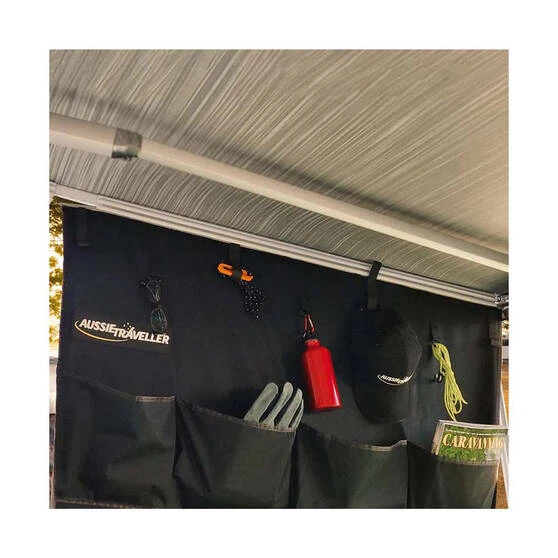 The Awning Organiser by Aussie Traveller is an essential bit of kit to help keep your gear clean and organised while you are enjoying the great outdoors. It’s made from tough poly cotton ripstop canvas and has 8 storage pockets, 4 mesh and 4 canvas. It easily mounts to the sail track of your awning or Anti Flap Kit and comes with guy ropes and pegs included to help keep it secure. Keep your gear organised and within easy reach on your next adventure with the Aussie Traveller Awning Organiser.