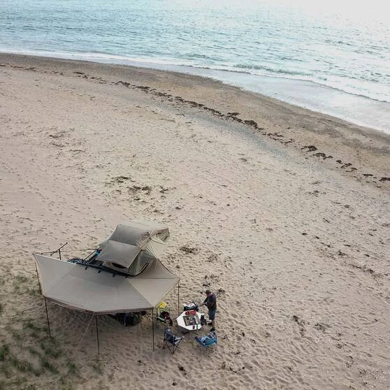 It’s made from premium 320gsm ripstop polycotton canvas with an impressive 1500mm water rating with seam sealing to make sure you stay dry in even the wettest conditions. The awning comes with all mounting brackets and poles needed for setup and comes in a heavy duty 600gsm PVC cover to protect it from the elements while you’re on the road.